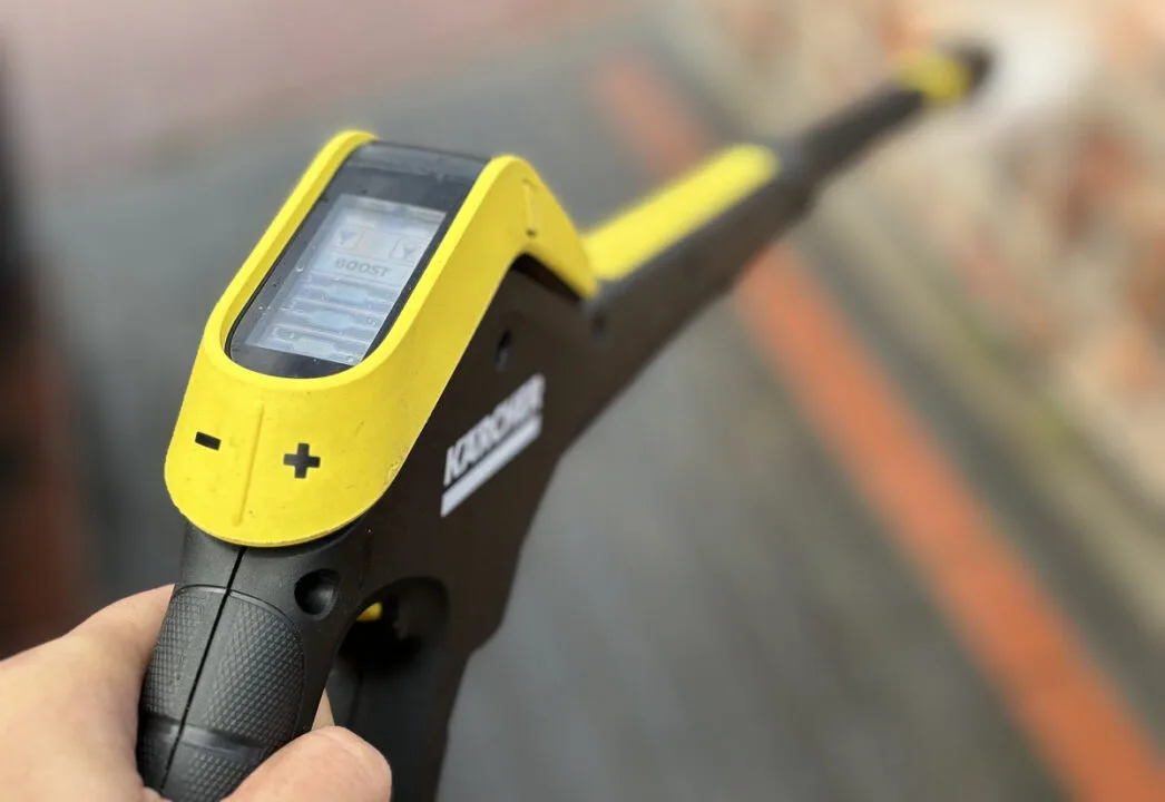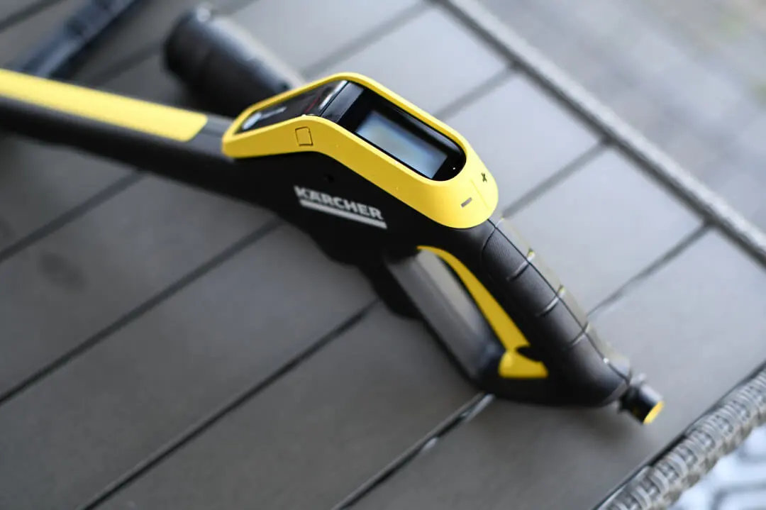 O tym, że mam do czynienia z bardziej zaawansowanym produktem, niż myjki, które widziałem dotychczas, przekonałem się zaraz po otwarciu opakowania. W środku znalazłem bowiem pistolet spryskujący Smart Control z wyświetlaczem LCD i przyciskami do regulacji ciśnienia lub dozowania środka czyszczącego. Myjka wspiera też połączenie Bluetooth na potrzeby aplikacji Home & Garden, ale o tym nieco później.