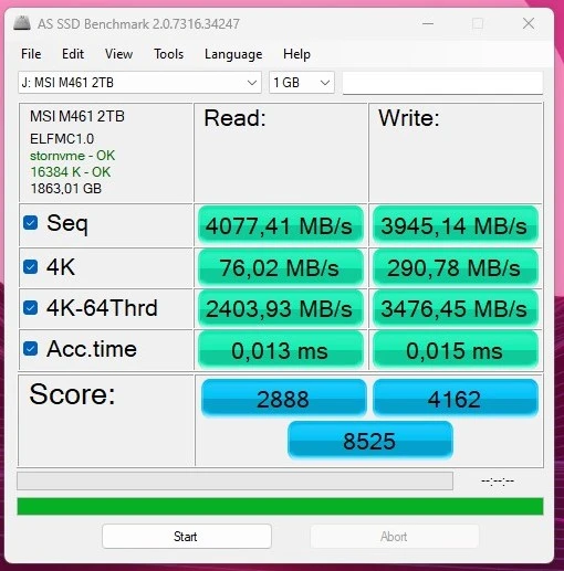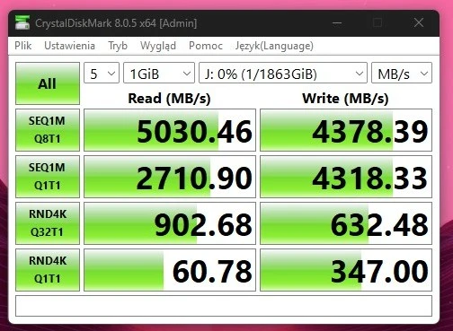 Testy w benchmarkach pokazują, że działanie MSI Spatium M461 2 TB przewyższa zapewnienia producenta. Prędkość sekwencyjnego odczytu danych zmierzona programem CrystalDiskMark to niemal idealnie 5000 MB/s (5030 MB/s), ale zapis wynosił już 4378 MB/s – miło. AS SSD potwierdził z kolei wartości IOPS.