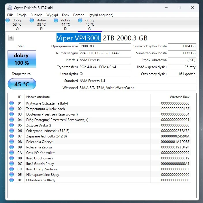 Byłem zdumiony temperaturami działania dysku Patriot Viper VP4300 Lite 2 TB. Przy braku jakiegokolwiek obciążenia osiągał temperaturę mniej więcej 37-45 stopni Celsjusza, w zależności od warunków panujących we wnętrzu obudowy. Pod obciążeniem temperatura rosła do maksymalnie 50/60 stopni Celsjusza – w zależności od czujnika. To znakomity rezultat. Warto odnotować, że wyniki osiągnięto na nowym firmware obniżającym temperatury – nie musiałem go jednak instalować, bo było preinstalowane.