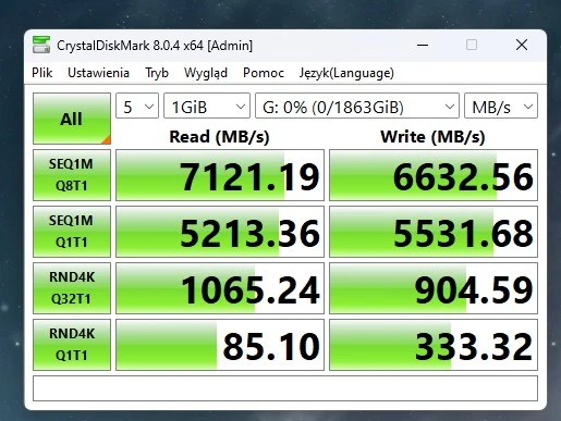 - Deklarowany sekwencyjny odczyt danych: do 7400 MB/s (dla wersji 2 TB)