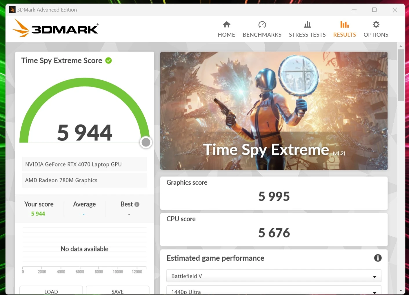 - Cyberpunk 2077 (1080p + RTX ultra + DLSS 3.5) – śr. 105 kl./s.
