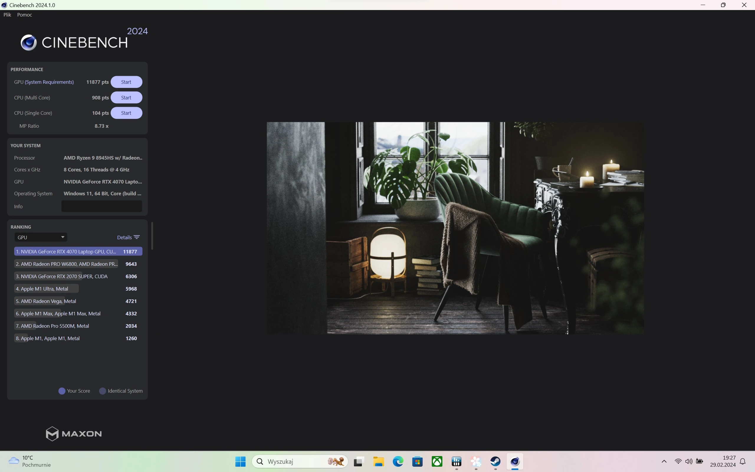 - Procesor: AMD Ryzen 9 8945HS (8 rdzeni, 16 wątków), 4-5,2 GHz