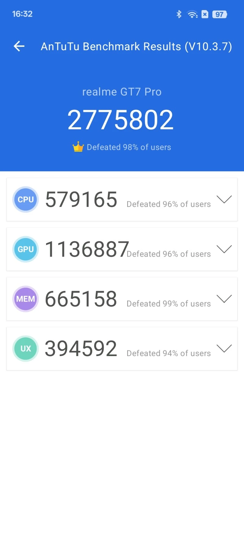 W AnTuTu 10 Realme GT 7 Pro uzyskał wynik dość daleki od trzech milionów, o których słyszeliśmy przed premierą. Wyniósł on bowiem 2 775 802 punkty. W Geekbenchu 6 smartfon zdobył zaś 2983 punkty w jednordzeniowym teście CPU, 9337 punktów w wielordzeniowym teście CPU i 19 249 punktów w teście GPU. Warto wspomnieć, że na tym urządzeniu można włączyć tak zwany „Tryb GT”, który w teorii ma zwiększać wydajność smartfonu. W praktyce nie zmieniał on jednak nic w działaniu urządzenia, a na wyniki benchmarków nie przełożył się na poziomie na tyle wysokim, bym mogła zauważyć różnice w wynikach inne niż na poziomie błędu pomiarowego.