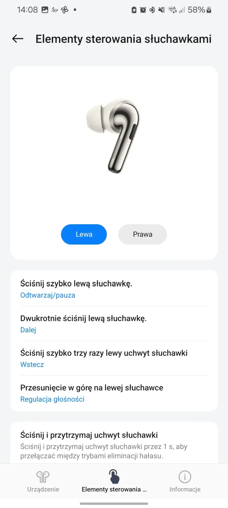 Co ważne, OnePlus Buds Pro 3 posiadają panele dotykowe, które pozwalają na dotykową obsługę słuchawek. Znajdują się one w przedniej części krótkich pałąków, a korzystanie z nich jest komfortowe i intuicyjne, zwłaszcza że pomyślne wykonanie gestu jest potwierdzane sygnałem dźwiękowym. Możemy ścisnąć jedną ze słuchawek by wstrzymać lub wznowić odtwarzanie, ścisnąć podwójnie, by przejść do następnego utworu lub ścisnąć i przytrzymać, by zmienić tryb ANC. Teraz możemy też na dodatek przesuwać po panelu dotykowym palcem w górę lub w dół, by zmieniać głośność odtwarzania.