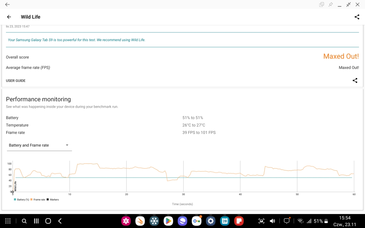Pod względem wydajności to oczywiście, jak już wspomniałem, nie ma się do czego naprawdę przyczepić. Tablet „po prostu działa” luźno cytując legendarnego Todda Howarda. Gdybym nawet chciał, to trudno byłoby mi się do czegoś przyczepić pod tym względem. Sprawdziłem Samsunga Galaxy Tab S9 w kilku scenariuszach i w żadnym nie zaliczył najmniejszej czkawki. Na tapet wrzuciłem Call of Duty Mobile, Genshin Impact i War Thunder Mobile. Żadna z tych gier nie spowodowała najmniejszego spowolnienia i wszystko działo tak, jak należy.
