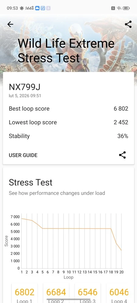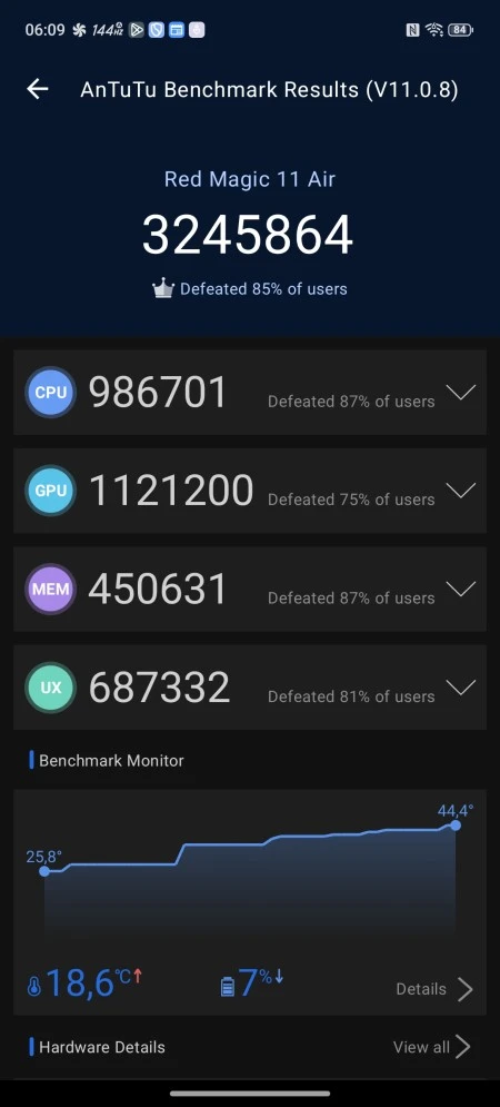 W końcu doczekaliśmy się czasów odrobinę pojemniejszych akumulatorów w smartfonach. Czas pracy na jednym ładowaniu wzrósł jednak nieznacznie, gdyż w urządzeniach tych umieszcza się bądź co bądź coraz wydajniejsze układy. W przypadku RedMagic 11 Air postawiono na akumulator 7000 mAh, ale i zasobożerny SoC Qualcomm Snapdragon 8 Elite. Bez problemu wytrzyma on 4,5-5 godzin grania w najbardziej wymagające tytuły, a więc podobnie jak inny testowany przez nas gamingowy smartfon ASUS ROG Phone 9 Pro. Jeśli chodzi o odtwarzanie wideo i przeglądanie sieci, również osiąga on ponadprzeciętne wyniki.