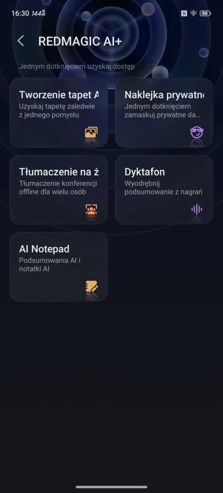 W systemie obecna jest też znacznie użyteczniejsze Centrum Gier (Game Space). Po uruchomieniu gry i włączeniu nakładki użytkownik dostaje dostęp do licznika klatek na sekundę, opcji związanych z taktowaniem procesora i GPU (da się tworzyć profile), czułością rejestrowania dotyku i próbkowaniem, nagrywaniem ekranu, ustawieniami wentylatora i garści innych drobiazgów. Ba, oprogramowanie gamingowej marki Nubia umożliwia także mapowanie przycisków z zewnętrznych kontrolerów sparowanych ze smartfonem.