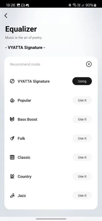 Domyślnie equalizer jest ustawiony w trybie VYATTA Signature i okazuje się, że jest to najlepszy profil ze wszystkich, niezależnie od tego, czego zamierzamy słuchać. Wszystkie pozostałe, nie wiem do końca dlaczego, sprawiają, że dźwięk brzmi bardzo sztucznie i nienaturalnie. Co więcej, można odnieść wrażenie, że traci on na głębi. Jeśli koniecznie chcemy zmienić charakterystykę brzmienia, warto pobawić się manualnym equalizerem, chociaż wydaje mi się, że za sprawą najlepszej jakości w trybie VYATTA Signature stoi coś więcej.