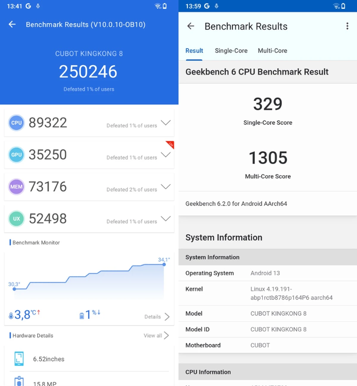 W benchmarku AnTuTu 10 Cubot KingKong 8 uzyskał zaledwie 250 246 punktów. W Geekbench 6 zdobył zaś 329 punktów dla pojedynczego rdzenia i 1305 punktów dla wielu rdzeni. To wyniki bardzo słabe, biorąc pod uwagę to, że mamy 2023 rok.