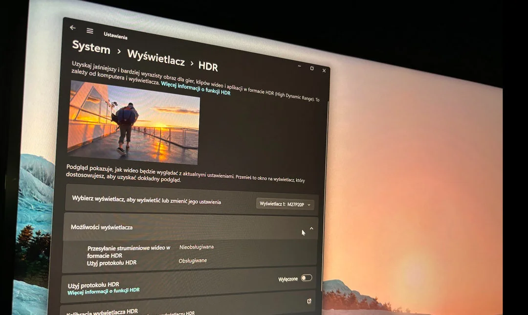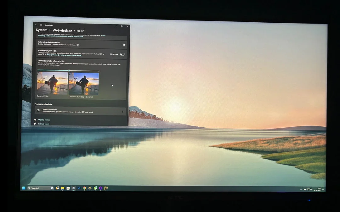 Zaskoczyła mnie niesamowicie wysoka jasność monitora, nawet w trybie SDR. Podczas codziennej pracy matryca „dawała po oczach” wręcz zbyt mocno, podczas gdy przy tych samych ustawieniach jasności idealnie sprawdzała się w grach. Problem ten rozwiązywało jednak włączenie w monitorze trybu HDR, w parze z trybem HDR w systemie Windows 11, który pozwala ustawić oddzielną jasność dla treści SDR i HDR.