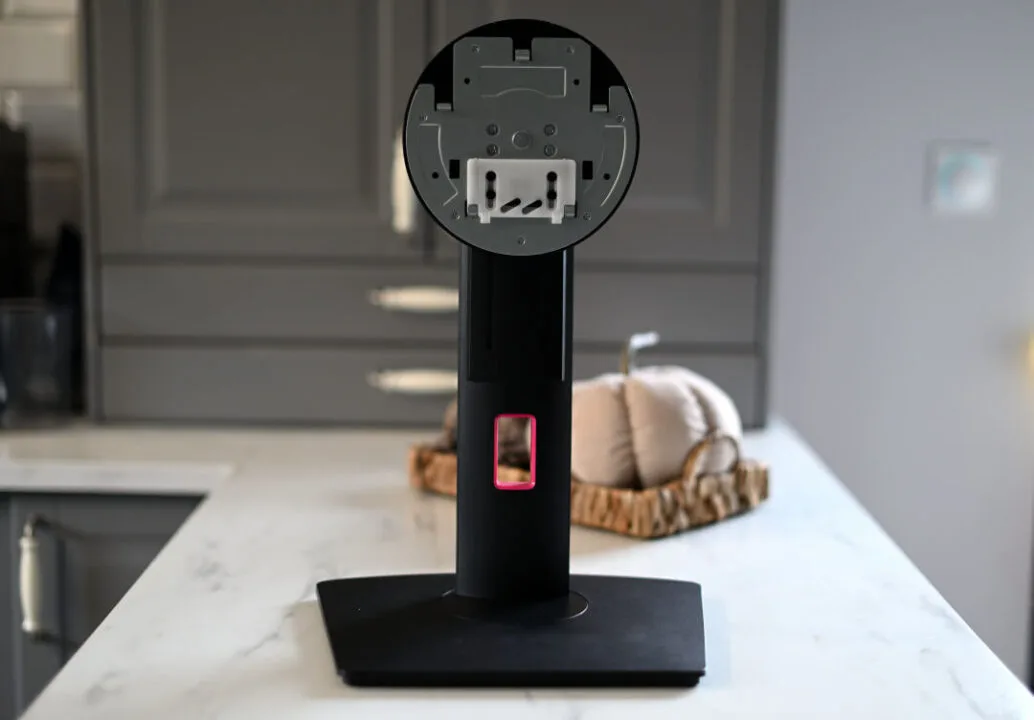 Rama podstawy jest oczywiście regulowana i pozwala na zmianę wysokości monitora. Zawiera też spory otwór na kable. Cały monitor możemy na ramie pochylać do przodu i do tyłu, obracać do pionu, a także na boki.