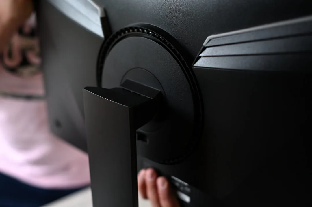 Zarówno podstawa, jak i obudowa samego monitora zostały wykonane z matowego tworzywa sztucznego. Z tyłu monitora widoczne są dwa pasy oraz umieszczony pomiędzy nimi okrąg – te trzy elementy są podświetlane, na kolor zielony, niebieski, czerwony lub w trybie „oddychanie” – do wyboru z poziomu menu OSD uruchamianego joystickiem, również widocznego z tyłu. Z tyłu i na górnej krawędzi monitora znalazły się też otwory wentylacyjne. Wszystkie porty umieszczono zaś w wysuniętej części tyłu monitora, pod wspomnianym okręgiem. Niestety dotyczy to też wszystkich portów USB. Dostęp do nich nie jest zatem zbyt wygodny. Wolę, gdy porty USB są wyprowadzone na bocznych krawędziach monitorów.