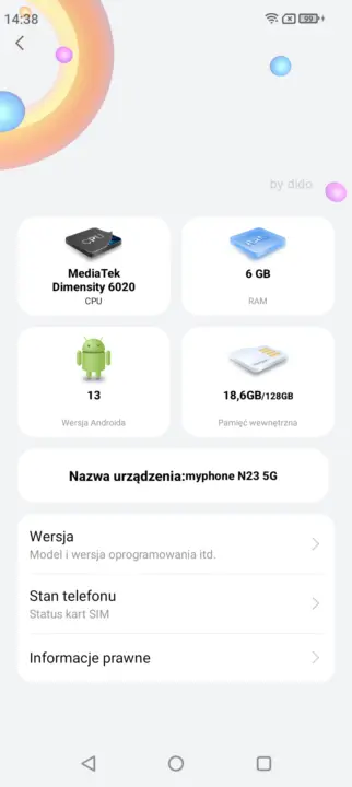 myPhone N23 5G pracuje pod kontrolą Androida 13 w niemal czystej wersji. System wygląda i zachowuje się standardowo, chociaż producent zastosował ciekawy zabieg skrócenia animacji systemowych, co sprawia wrażenie, że interfejs działa jeszcze szybciej. Ogólnie, działanie urządzenia jest sprawne i stabilne.
