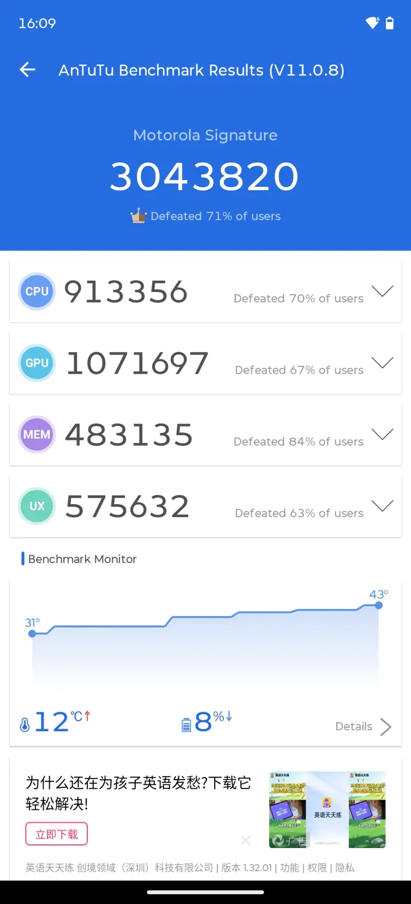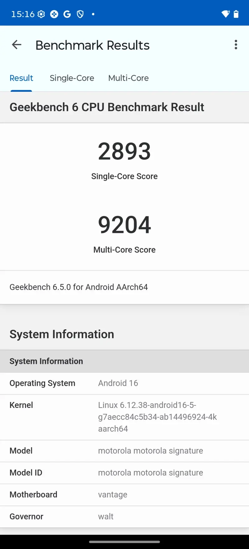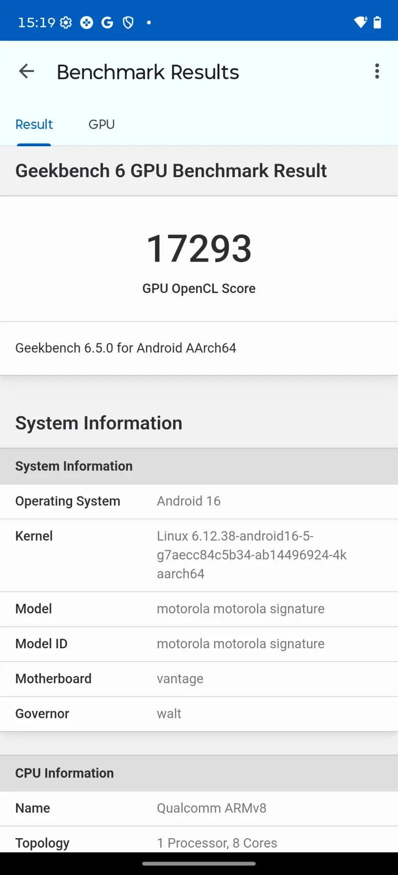 W AnTuTu 11 Motorola Singature uzyskała 3 043 820 punktów. W Geekbenchu 6 mowa zaś o wyniku na poziomie 2893 punktów w przypadku pojedynczego rdzenia CPU, 9204 punktów w przypadku wielu rdzeni CPU i 17 293 punktów w przypadku GPU. Trudno na te wartości narzekać.