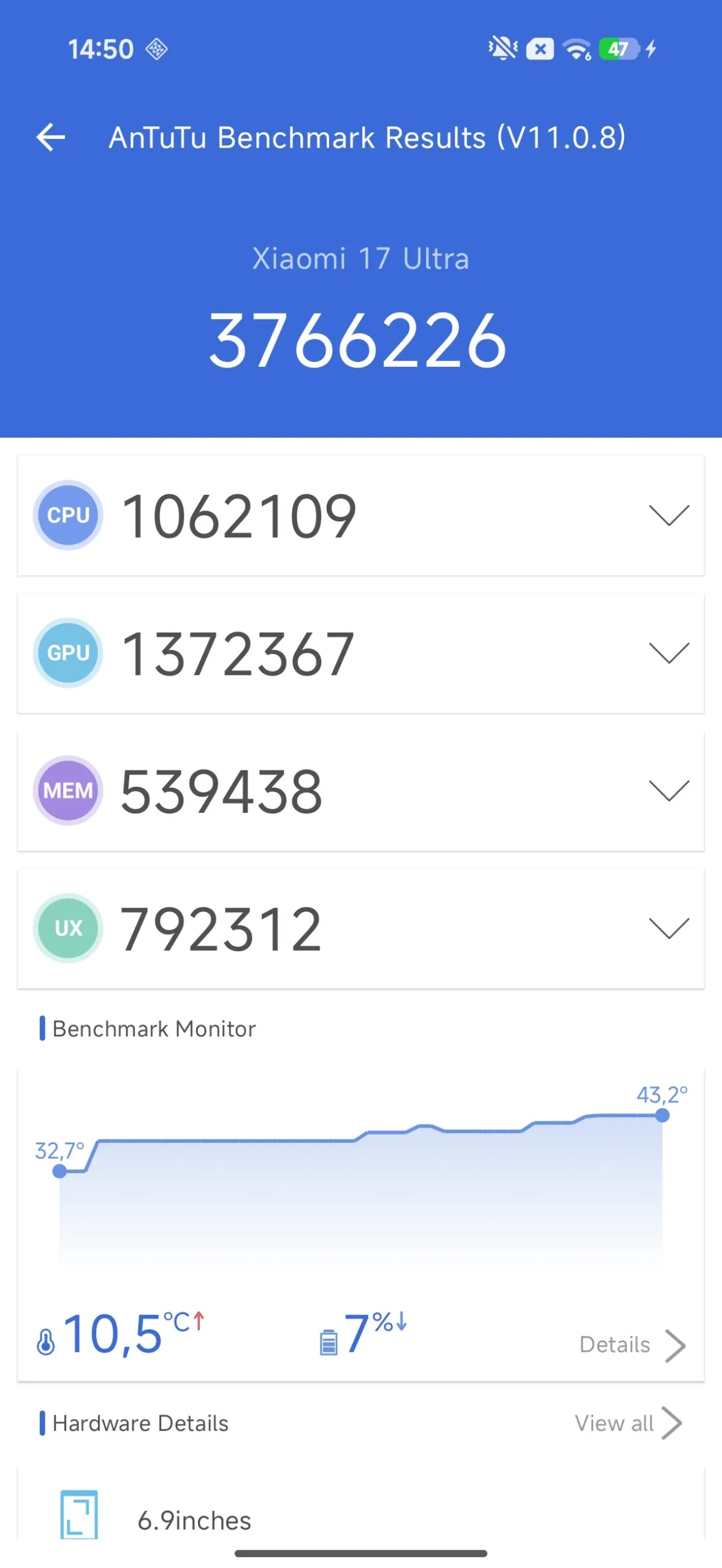 Nie każdy flagowy smartfon z układem Qualcomm Snapdragon 8 Elite Gen 5 jest tak samo wydajny i dotyczy to oczywiście wydajności także innych chipsetów. Spore znaczenie mają optymalizacje oprogramowania, ale i zastosowane w telefonach układy chłodzenia. Xiaomi 17 Ultra jest jednym z najwydajniejszych smartfonów na świecie, zachowując wysoką kulturę pracy i stabilność pod długotrwałym obciążeniem. W 3DMark Wild Life Extreme Stress Test GPU utrzymywało stabilność na poziomie zbliżonym do 70%, a obciążony procesor włączał throttling z mocą obliczeniową stabilizującą się na poziomie 60%. To naprawdę przyzwoite wyniki, podobnie jak ten osiągany w benchmarku AnTuTu 11 – 3766226 punktów.